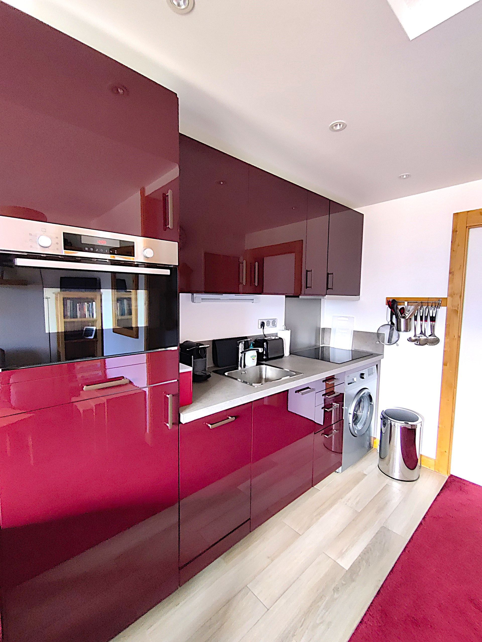 - Une cuisine ouverte meublée et équipée : plaque induction, hotte aspirante, four combiné micro-ondes, réfrigérateur, lave-linge, lave-vaisselle, cafetière filtre et Nespresso, grille-pain, bouilloire, presse-agrumes, mixer, appareils à Raclette et à Fondue, vaisselle et couverts, ustensiles et batterie de cuisine…